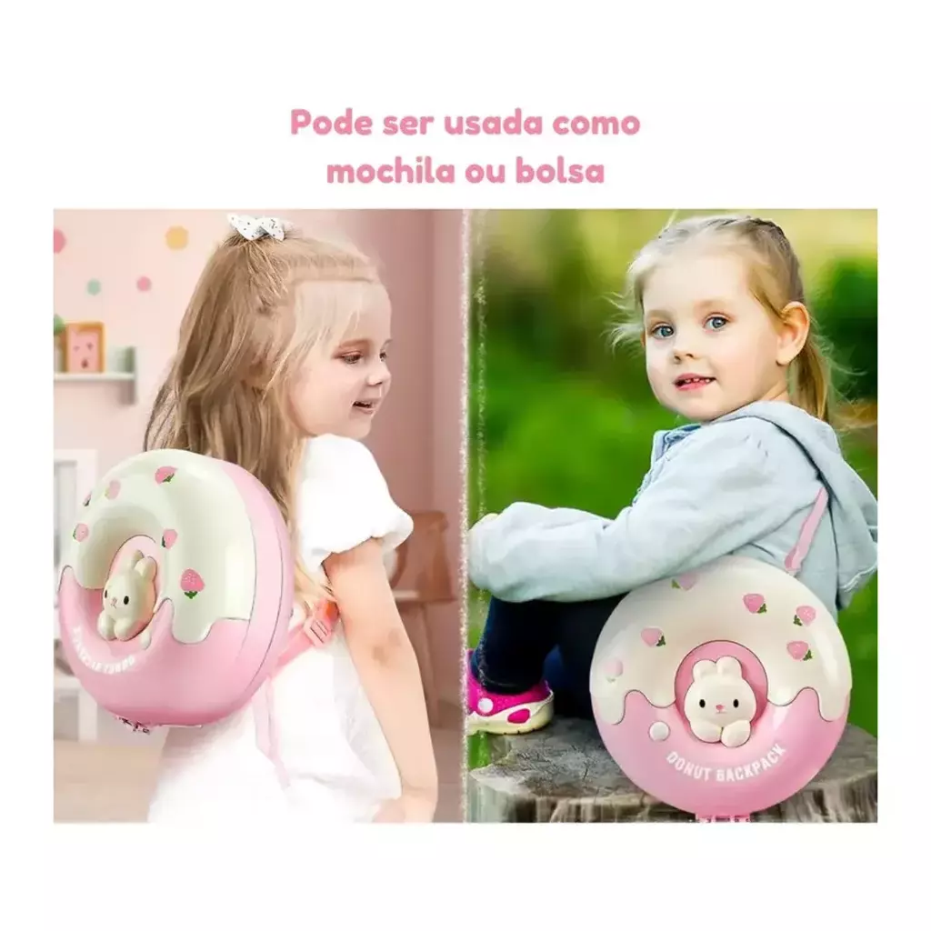 Encantadora e prática, essa maleta em formato exclusivo de donut traz cores vibrantes e detalhes únicos que conquistam à primeira vista. Pode ser usada de três maneiras: como maleta, mochila ou bolsa transversal, graças à alça regulável que se adapta ao estilo da criança.