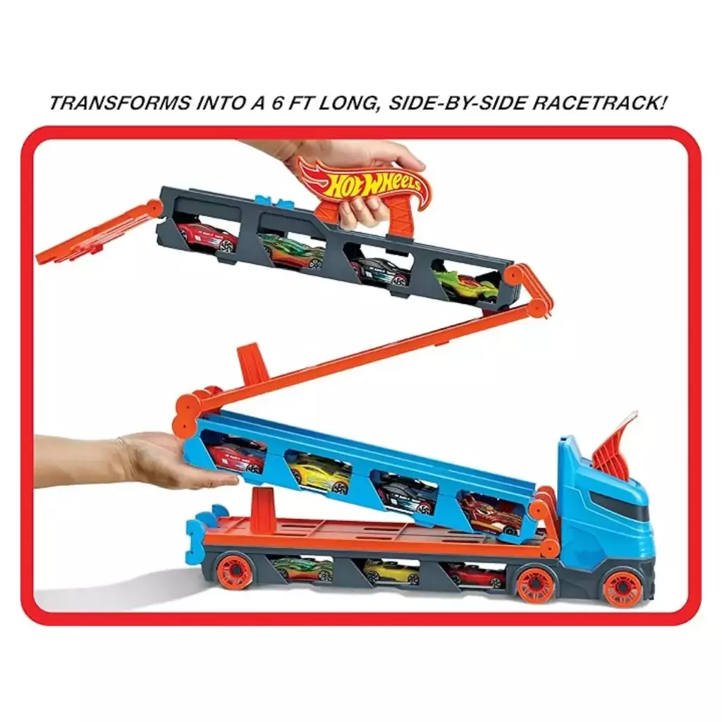 Com design versátil e funcional, o caminhão carrega até 22 veículos em escala 1:64 (3 inclusos), exibidos em janelas laterais transparentes que deixam a coleção ainda mais impressionante. A diversão começa quando a parte traseira é liberada: o reboque se abre e vira uma pista de corrida radical, com lançador duplo na cabine para corridas justas e cheias de emoção.