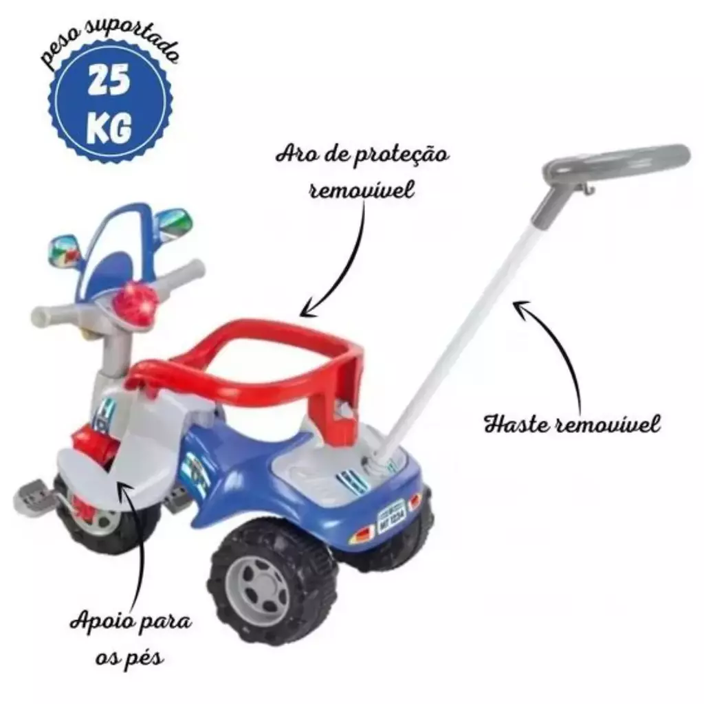 Diversão, segurança e desenvolvimento andam juntos com o Triciclo Infantil Tico-Tico Zoom Polícia da Magic Toys! Com design temático de viatura, luzes e sirene, esse triciclo é perfeito para estimular a coordenação motora e a interação entre pais e filhos. Pode ser usado como pedal ou passeio, graças ao empurrador removível e suporte para os pés. Além disso, acompanha aro de proteção, assento anatômico e até um capacete para completar a brincadeira com estilo e segurança!